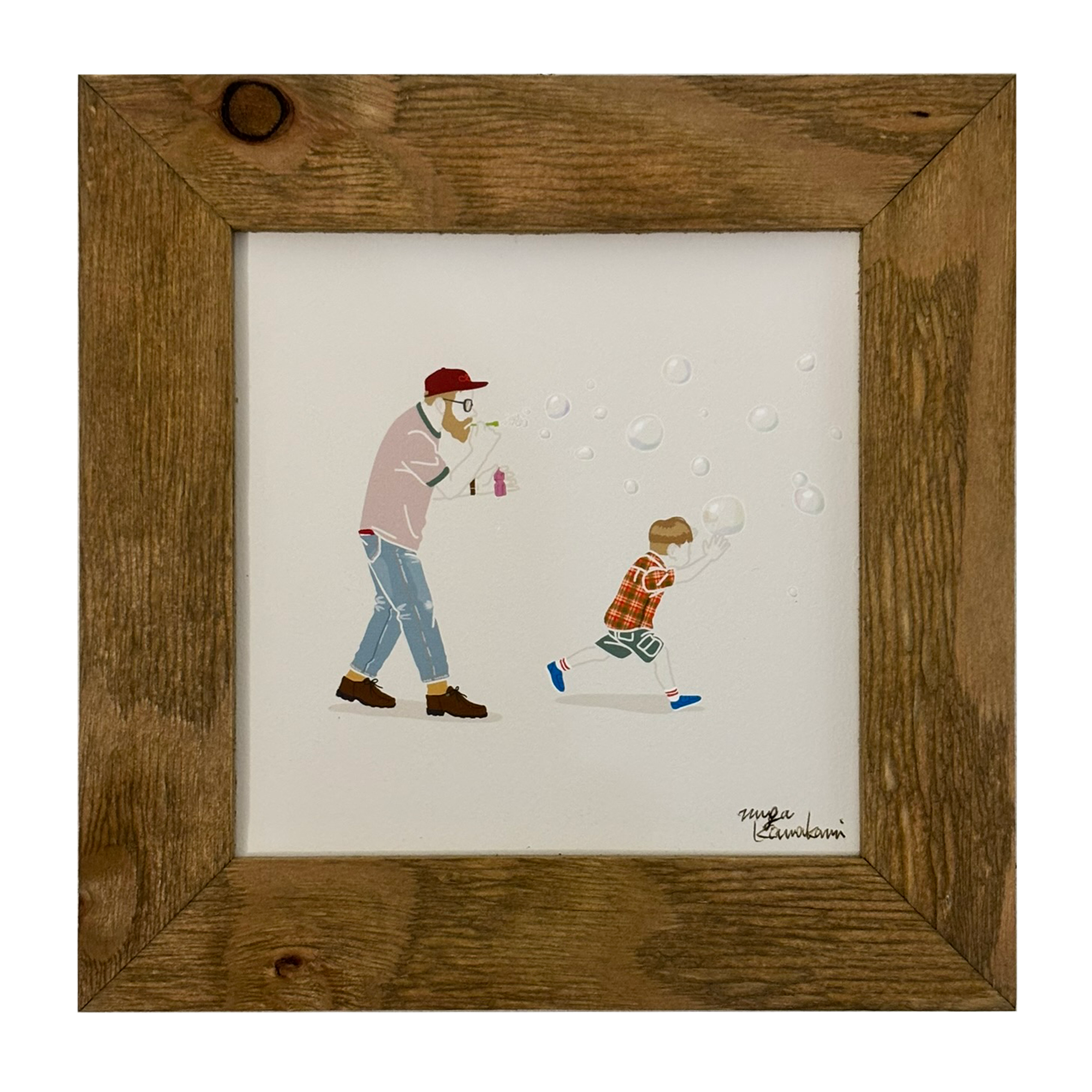 額装イラストプレミアム 「シャボン玉と親子」