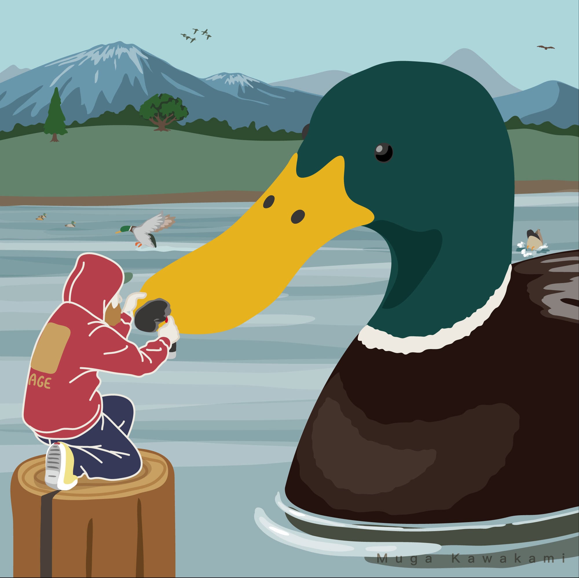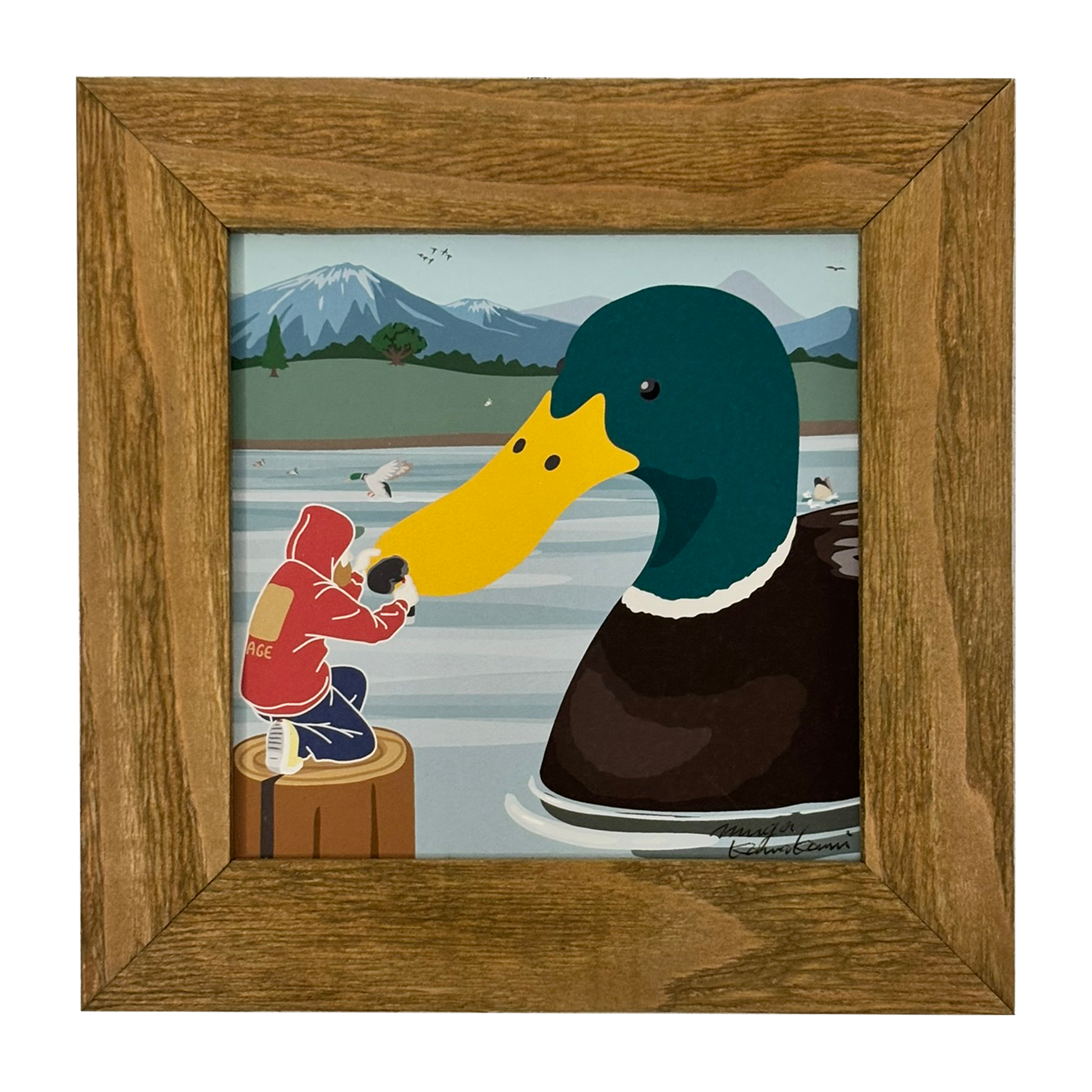 額装イラストプレミアム 「マガモにマーキングする小人」